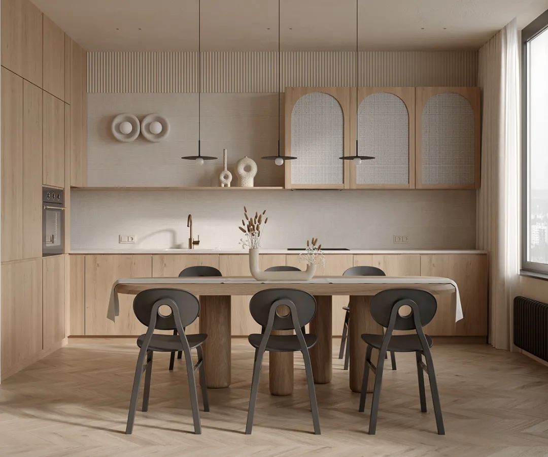 這種形式是目前非常受歡迎的形式,也是備受追捧種草的網(wǎng)紅島臺(tái),島臺(tái)與餐桌之間18公分的高差,以及交接處餐桌的側(cè)插處理,形成了空間中強(qiáng)烈的幾何符號(hào),在功能上也更加多元,餐桌的長(zhǎng)度如果空間足夠,最好做到更長(zhǎng),更好更舒適的滿(mǎn)足用食、社交、學(xué)習(xí),玩樂(lè)、品茗等功能。