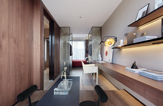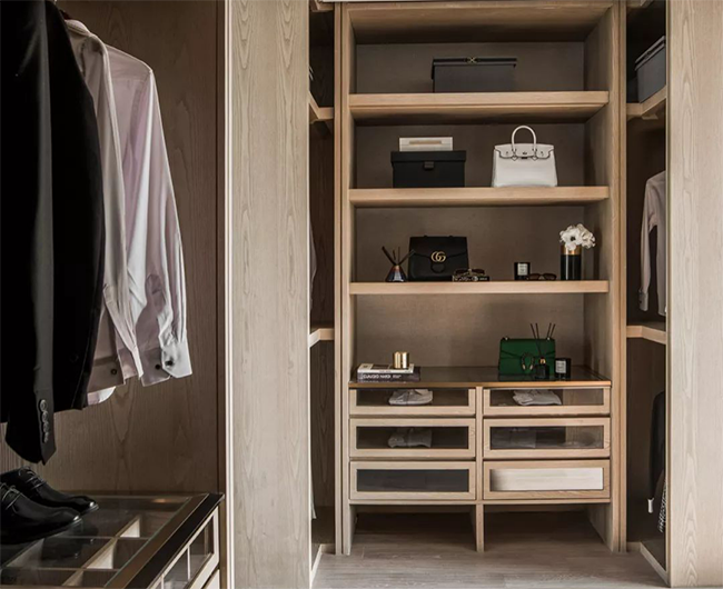 設(shè)計師在設(shè)計中添加了步入式衣帽間這個空間,將衣帽間簡潔合理地劃分,使用了隔板和金屬掛件的完美結(jié)合將衣物分空間收藏,這種衣帽間改變了傳統(tǒng)的衣物收納方式,將衣柜透明化,讓所有衣物都明朗地呈現(xiàn)在眼前,減少了盲目翻找的不便,讓衣物的儲藏,從無序狀態(tài)變?yōu)榫袟l。這樣一來,房主就可以在這個舒適、寬松、獨立、私密的更換空間從容不迫地進(jìn)行配衣過程,而與外界日常生活互不干擾。