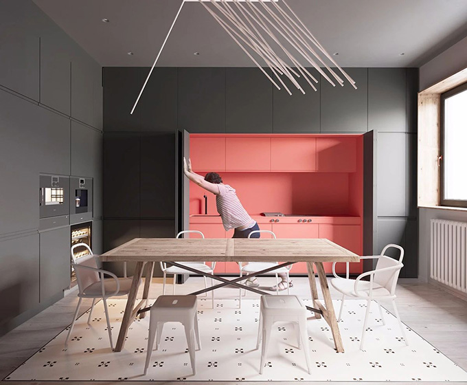 隱藏式廚房,并不是把廚房空間給隱藏,而是把廚房相應(yīng)的功能隱藏起來,極簡(jiǎn)的生活態(tài)度就是,用不到的時(shí)候能夠隱藏起來保持美觀,用到的時(shí)候觸手可及,也就是“已知存在卻看不見”的設(shè)計(jì)方式,這也正是隱藏式廚房的核心邏輯。