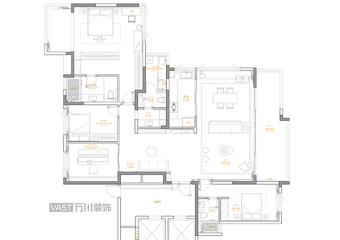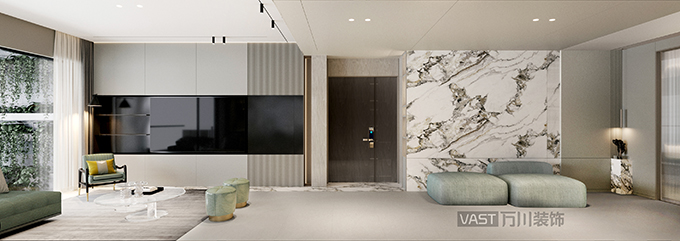 空間處理上,找到了最合適的比例關(guān)系,運(yùn)用各種材質(zhì)進(jìn)行穿插重組,通過序列的設(shè)計語言,讓整個客廳空間主次分明,增強(qiáng)了空間節(jié)奏感的體驗。