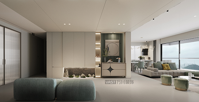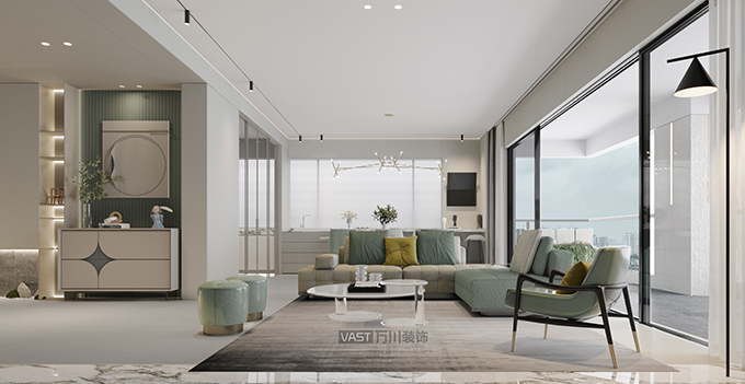 本案大面積運(yùn)用薄荷綠,這個色系非常清爽自然、不覺煩膩,色系簡潔、線條柔和、材質(zhì)細(xì)膩,營造舒適、經(jīng)得起歲月、云淡風(fēng)輕的美,讓家富有治愈力。