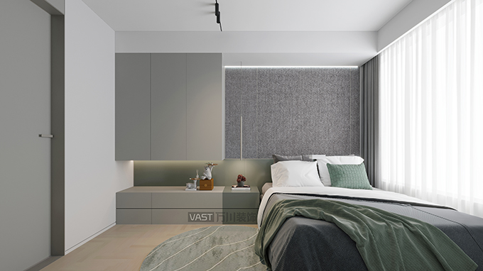 通過空間內(nèi)形狀、虛實(shí)、遠(yuǎn)近的合理配置,強(qiáng)調(diào)質(zhì)感,既顯時尚新穎,又為其增添動感活力。映著白色窗簾透進(jìn)的日光,讓臥室簡約中帶有變化。
