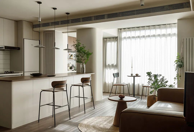 中島式吧臺往往是大戶型開放式廚房的標配,位置方面,設計師在設計時一定要根據(jù)廚房格局來合理設計,再結(jié)合業(yè)主們的活動路線讓中島臺變成家庭成員互動的中心,功能方面,不僅可以將吧臺當做餐桌日常使用,還可以作為輔助的操作臺區(qū)域,實現(xiàn)一臺多用,部分住宅會將吧臺與房屋承重結(jié)構(gòu)進行咬合,緊密相連