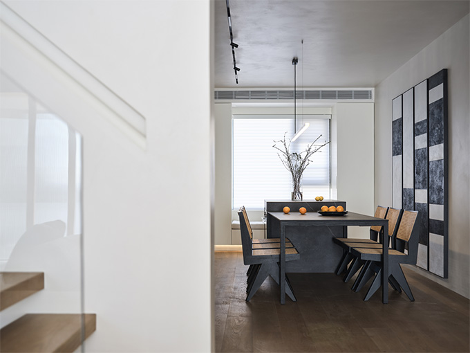 餐桌與廚房的櫥柜操作臺平行并列排布,一般適用于單排一字型廚房,空間結(jié)構(gòu)比較規(guī)整,形式感強。