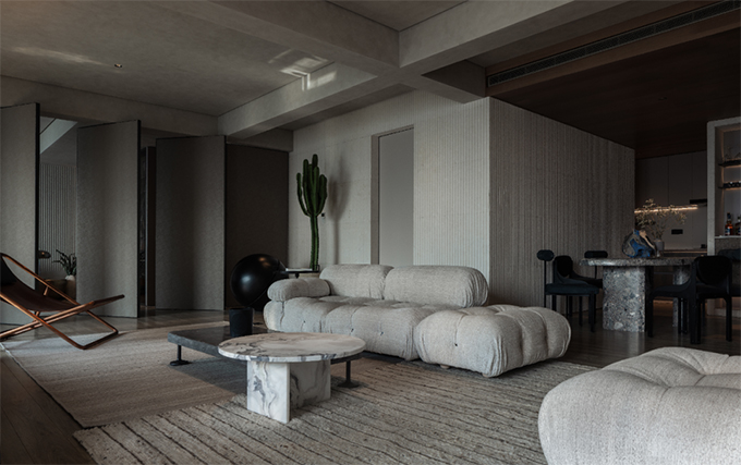 想讓廚房賦予社交屬性,首先先從中式傳統(tǒng)的封閉廚房跳脫出來打破之間的隔閡,拆除打通,與周邊空間聯(lián)結(jié),與起居室相接,或者與餐廳相接,既然廚房打通做成開放式,那么在廚房的設(shè)計(jì)上要注重空間設(shè)計(jì)的整體性,與周邊空間的格調(diào)氛圍相互統(tǒng)一。社交廚房做成開放式不代表和周圍空間沒有邊界通??梢詢?nèi)置物品架,或者是玻璃墻做成半墻式,當(dāng)然還有若干種其他的做法營造廚房和周圍空間分隔軟邊界的視覺感受,既可以作為過渡,也可以滿足收納功能,充分提高空間的利用效率,節(jié)省空間面積。