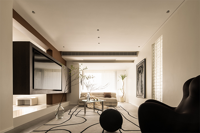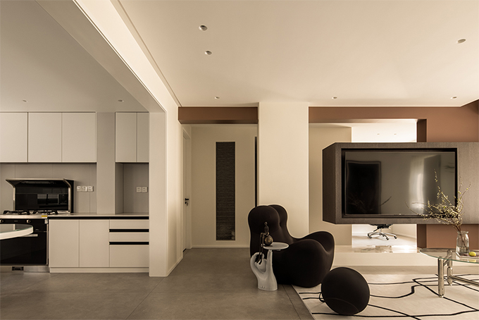 垂拔挺立的超高柜門,除去了把手的多余突兀感,給人的第一感覺更像是抽了縫的墻面,抽縫的線條也賦予了塊面的層次感和流動感,讓整個柜門看上去并不會單調(diào)乏味,上下連貫垂拔,左右連續(xù)的超高柜門,形成的多層次塊面讓空間的整體性更強(qiáng)。