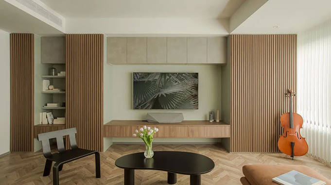 電視墻是客廳的一個(gè)主要構(gòu)成部分,它決定了整個(gè)空間色調(diào)的運(yùn)用以及風(fēng)格的搭配,合適的背景墻,總能凸顯出主人的生活態(tài)度和品位,綻放出不同的光彩。電視墻最好選擇清新淡雅風(fēng)格的,因?yàn)樗枰碎L(zhǎng)時(shí)間的直面,色彩簡(jiǎn)單,造型簡(jiǎn)約的電視墻要比沉穩(wěn)厚重,色彩艷麗的墻面耐看很多。在細(xì)節(jié)處更能給我們遐想的空間,清新的顏色也不會(huì)成為空間的視覺焦點(diǎn),將人們的視覺想象充分留給其他的空間。